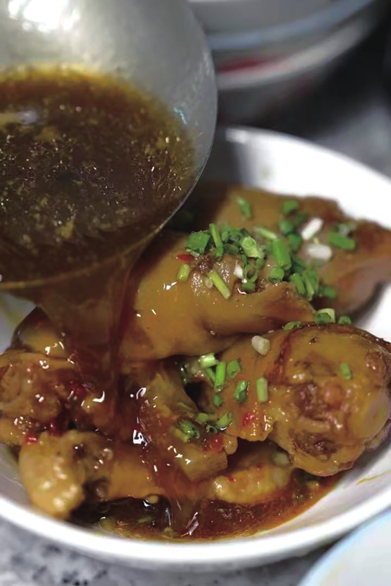 店面陈设简单,仅有二三张四方桌,门边的锅里始终冒着热气,店主忙碌的身影在雾气中若隐若现。这里的用餐方式也别具一格,食客落座后,每人会得到一只小碗,桌中间摆放着一个充满年代感的大陶瓷杯,店内还免费提供自酿酒。首先上桌的不是面,而是一碗主菜,里面有半边猪脚、一条猪尾,整块整条地堆了满满一碗,汤汁澄明透亮、油光闪闪,几样主菜吃下来,满口留香,再喝上那碗酒,顿感神清气爽。这时,面条才端上来,宽汤窄面,食客将菜碗的汤汁一滴不剩地倒在面碗里,拌匀后滋溜几下全部入肚,味蕾的满足、喉头的爽滑、肠胃的惬意无以言表。
