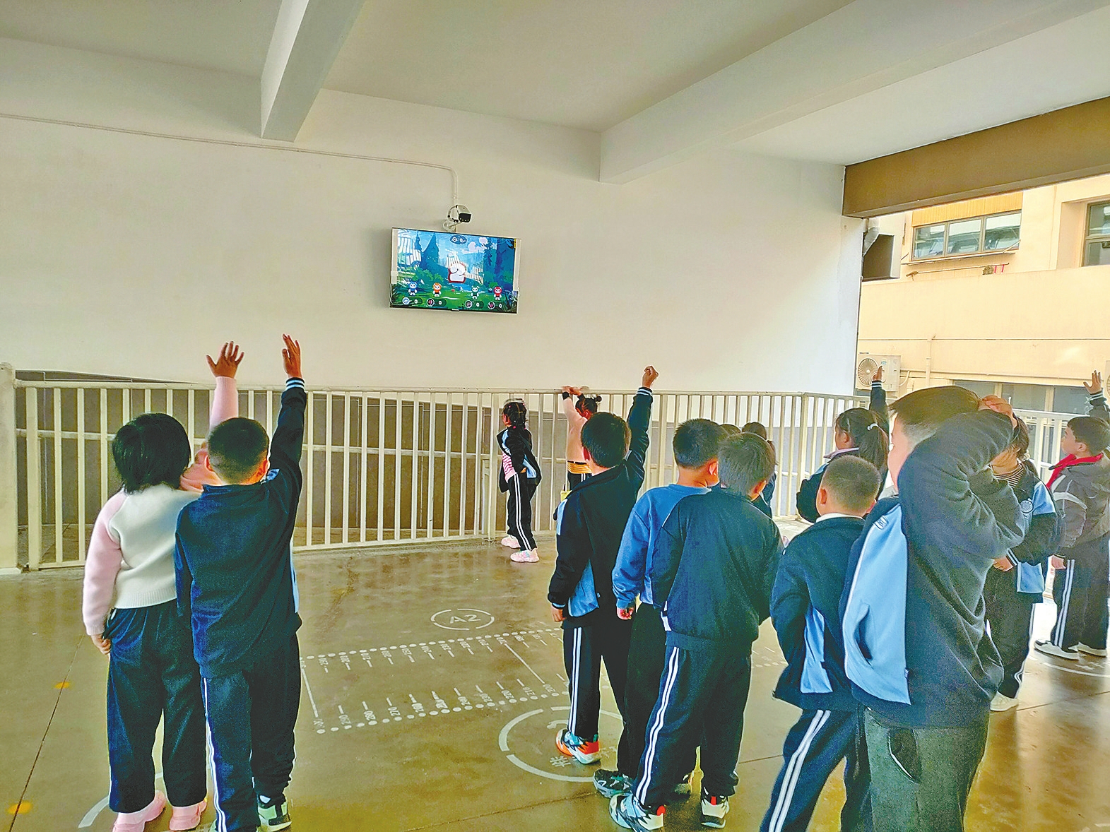 图为AI体育角安装后,学生举手激活游戏项目。苏钢摄