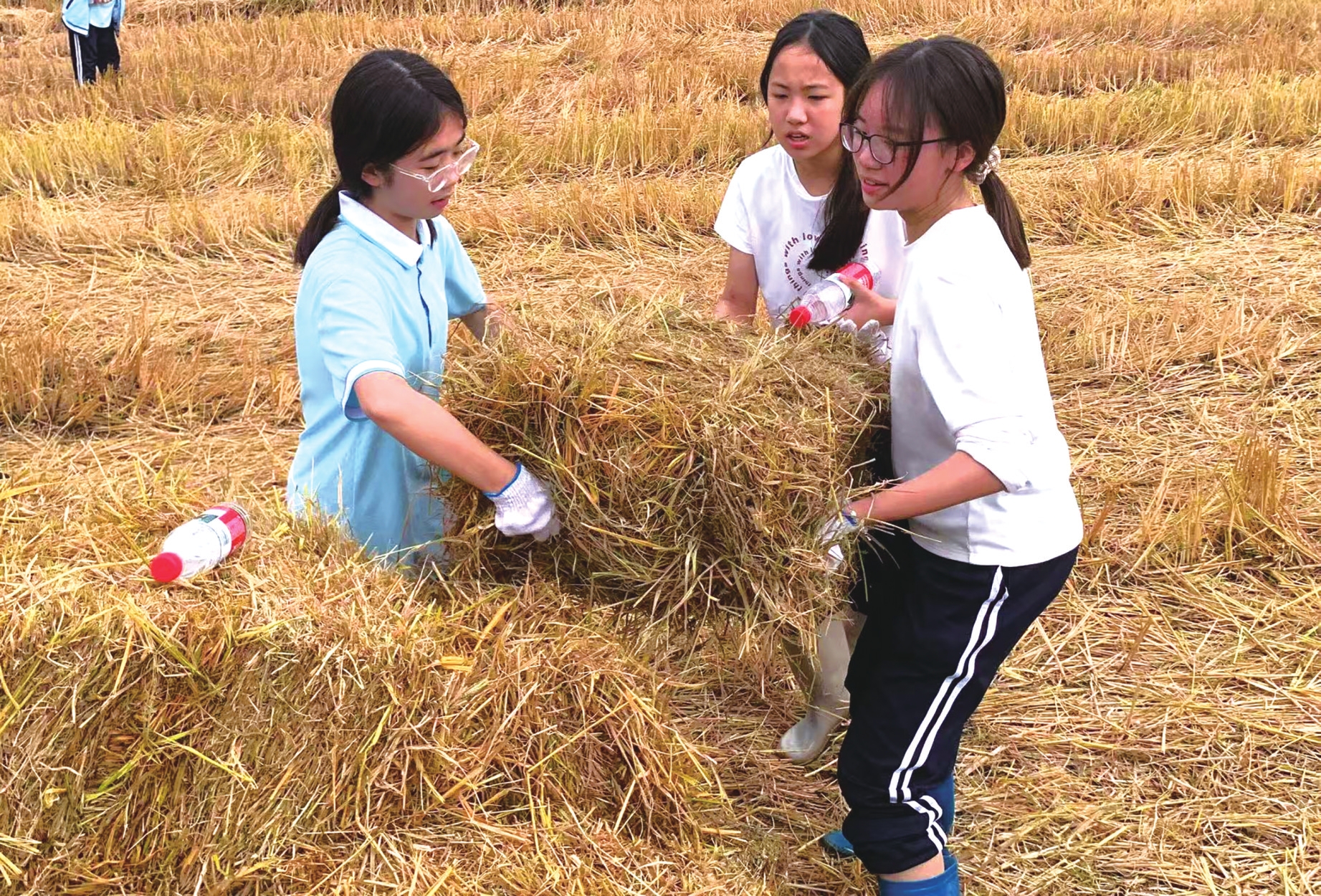 同学们齐心合力把秸秆打捆离田。张晶摄