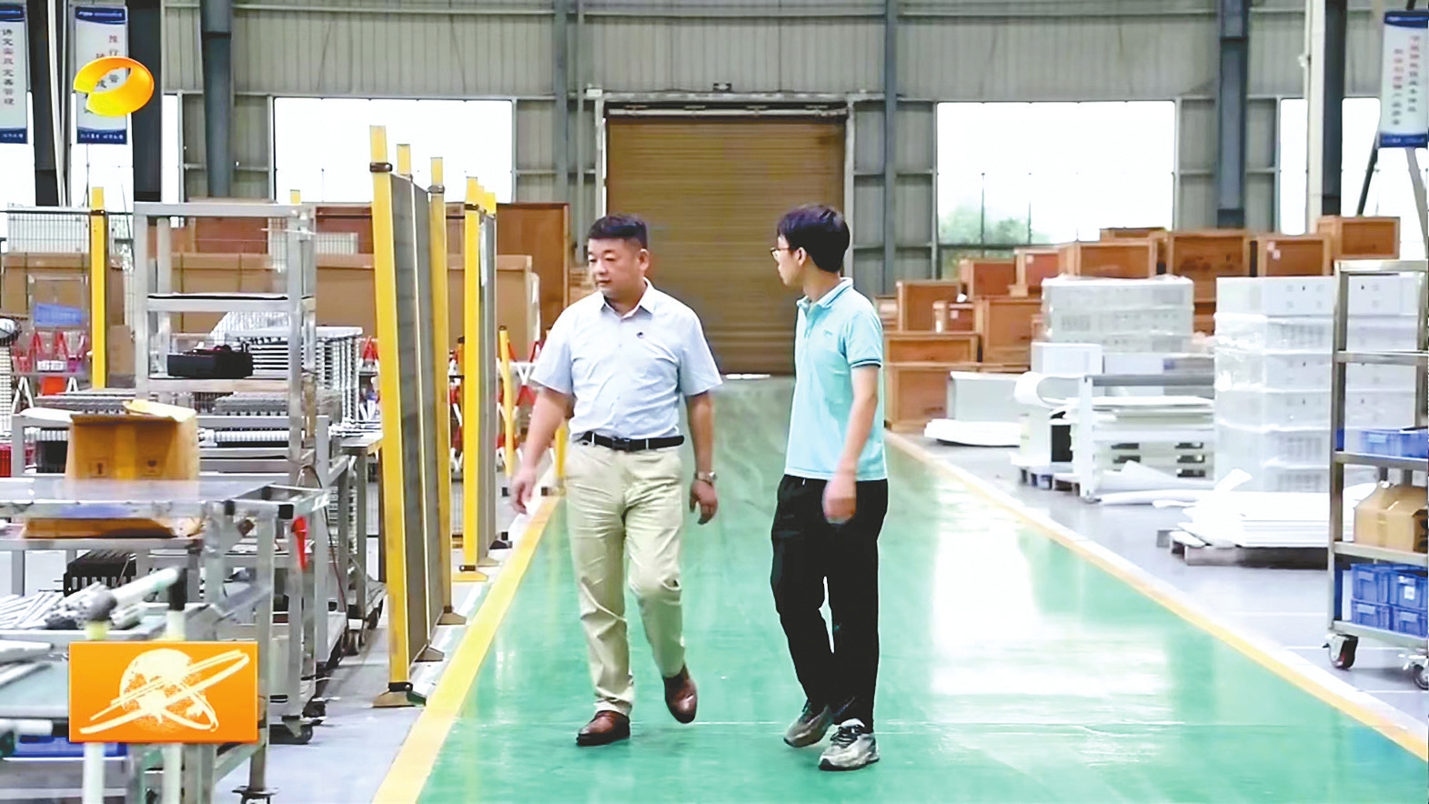 李稳根(左)在新车间指导员工进行设备安装。