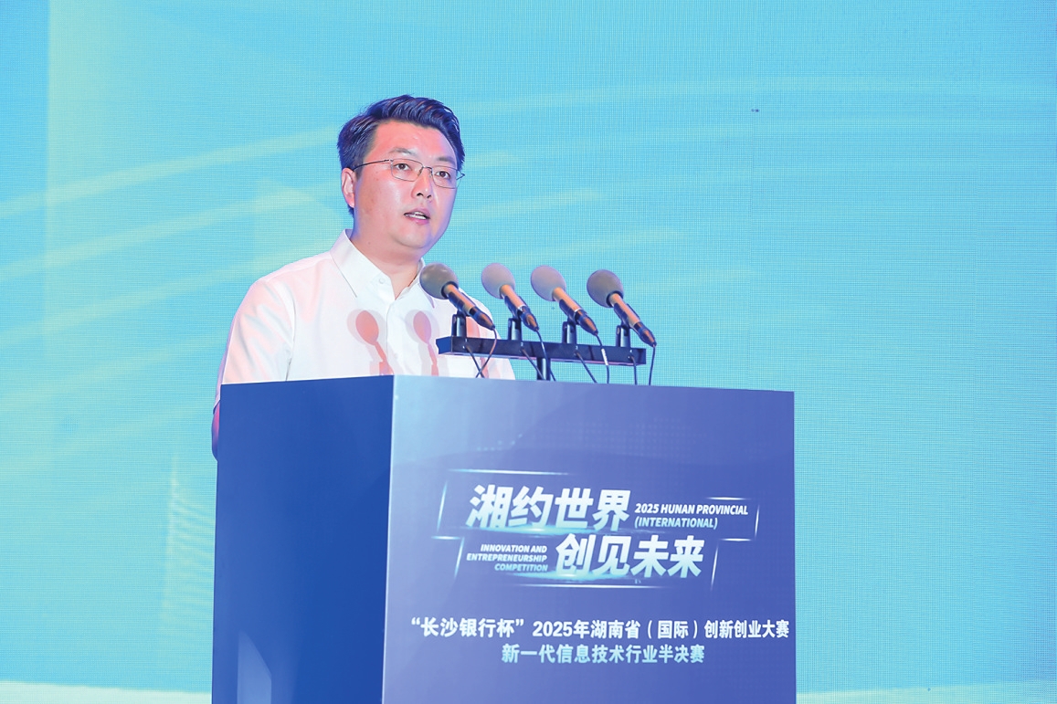 长沙银行益阳分行党委书记、行长杨俊在“长沙银行杯”2025年湖南省(国际)创新创业大赛新一代信息技术行业半决赛上致辞。