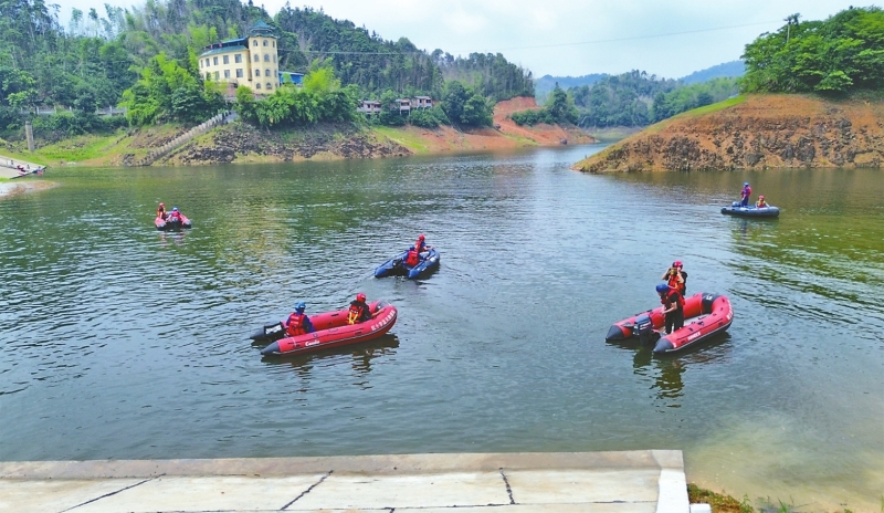 2025年益阳市山丘区山洪地质灾害防御暨水库抢险军地联动演练现场水上救援。