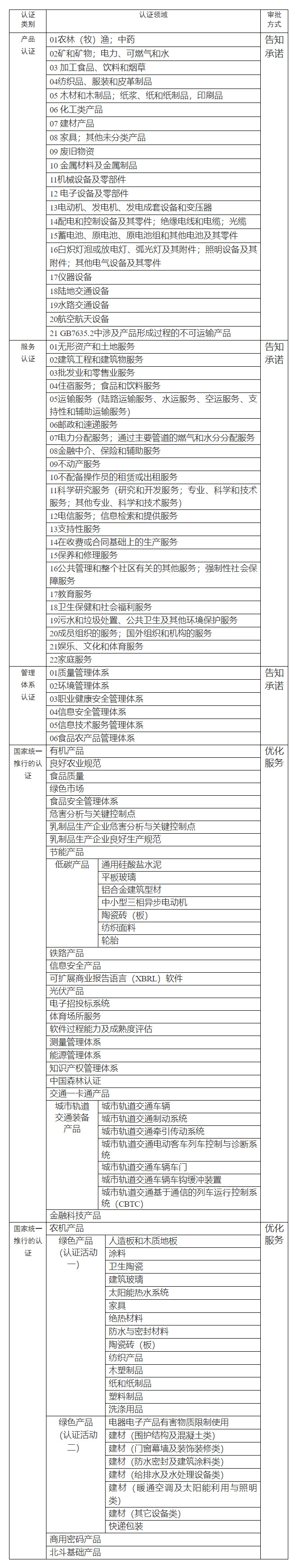 实行告知承诺及优化审批服务的认证领域目录