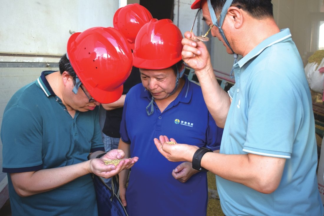 省粮食和物资储备局领导对技术创新后的储备粮细致观察。
