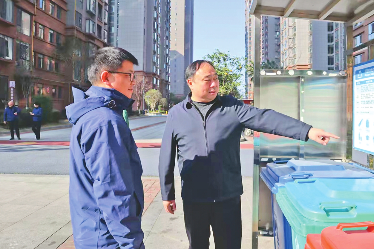 范志波(右)正在小区检查垃圾分类情况。刘馨予摄