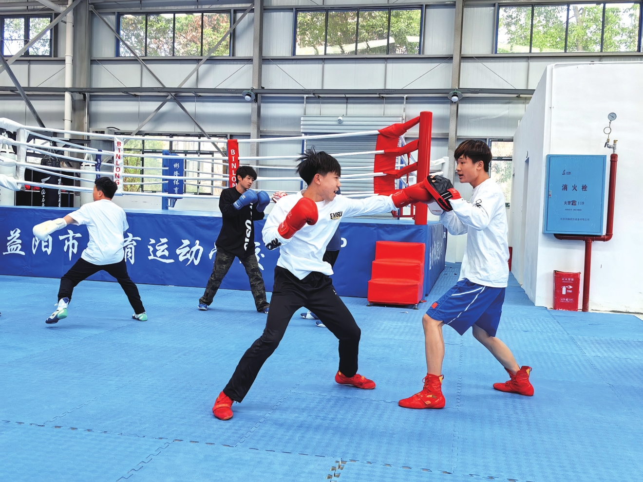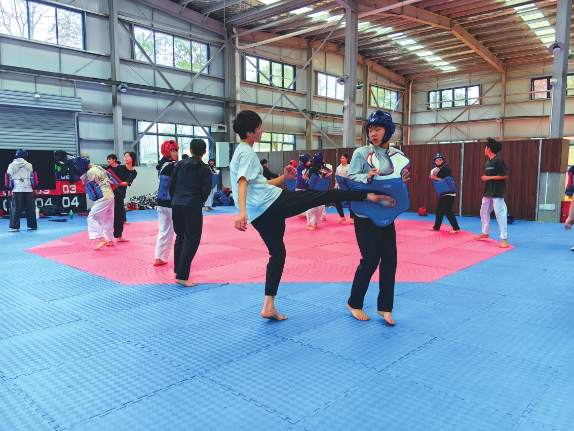 记者在现场看到,宽敞的空间被划分成了4个训练区域。摔跤区软垫上,两组人马正在对抗,少年们弓着背,紧盯对手,手指紧扣跤衣,脚跟狠扎垫面,喘息声短促有力。柔道区内,受身翻滚此起彼伏,身体撞击垫子发出沉闷的“砰砰”声,队员刚被摔落,立即弹起,迅速伺机抓住对手襟领。“哈!”跆拳道馆的踢靶声清脆炸裂,运动员们赤足而立,脚背红肿,每一记踢踹都带着风声,汗水化作热气从头顶散入空气中。拳击台上,绳圈震颤。两名队员用护具蒙面,前后滑步,刺拳试探间突然后手直拳,给了对手一记重击。这是新馆的第一个春天,也是他们向省运会冲刺的起点。