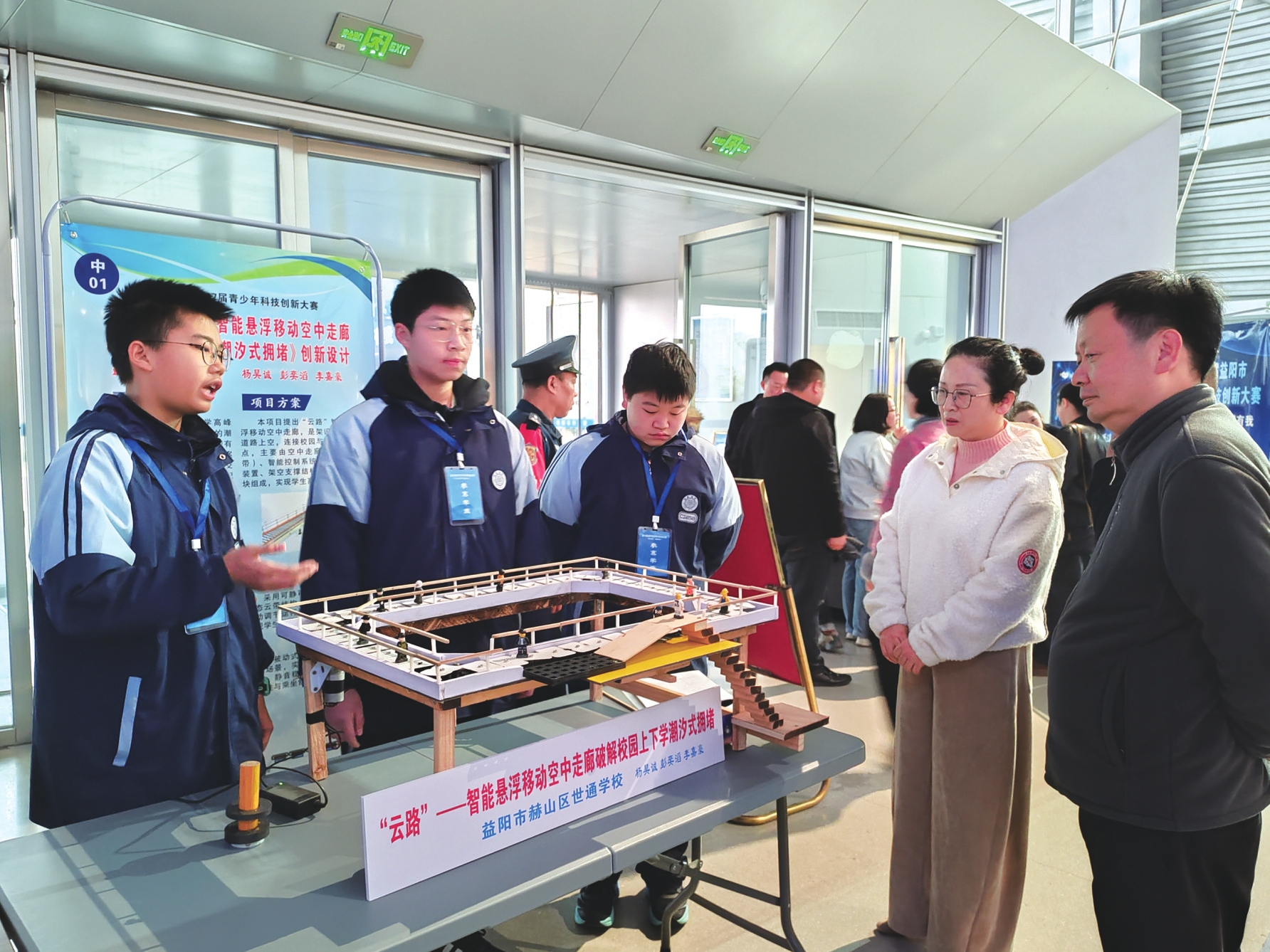 “这个设计可以将学生通行由地面转移到空中,实现人车物理隔离,从根源上消除人车混行带来的拥堵与安全隐患。”来自赫山区世通学校的参赛选手杨昊诚一边演示《“云路”——智能悬浮移动空中走廊》设计模型,一边向评委讲解。评委们进行评审问辩,结合综合材料和现场表现进行评分。