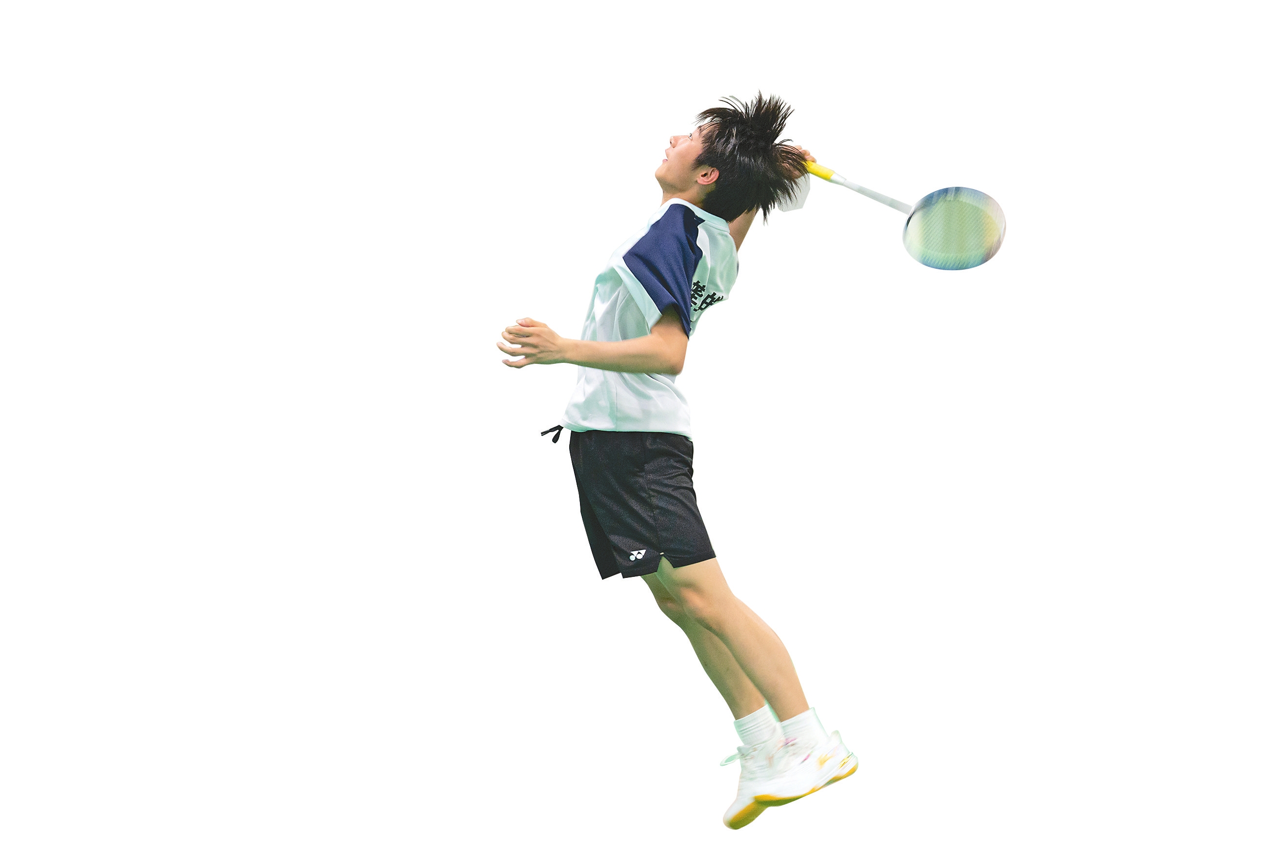 羽毛球馆内,队员在做起跳扣杀训练。