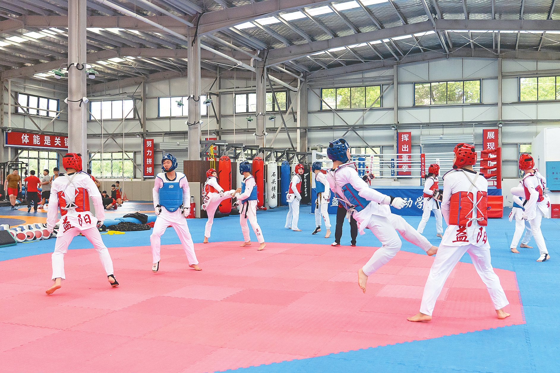 在市少年儿童体育学校训练馆里,柔道运动员猛地后倒,借力将对手凌空摔过肩,随即迅速翻身压制;摔跤垫上,两人弓背对峙,汗水洒落;跆拳道训练中,运动员后旋踢衔接横踢,连击如暴风骤雨;深蹲抓杠,猛力提铃,蹬腿上挺……举重训练区域,传来一声声成功挺举后的怒吼。