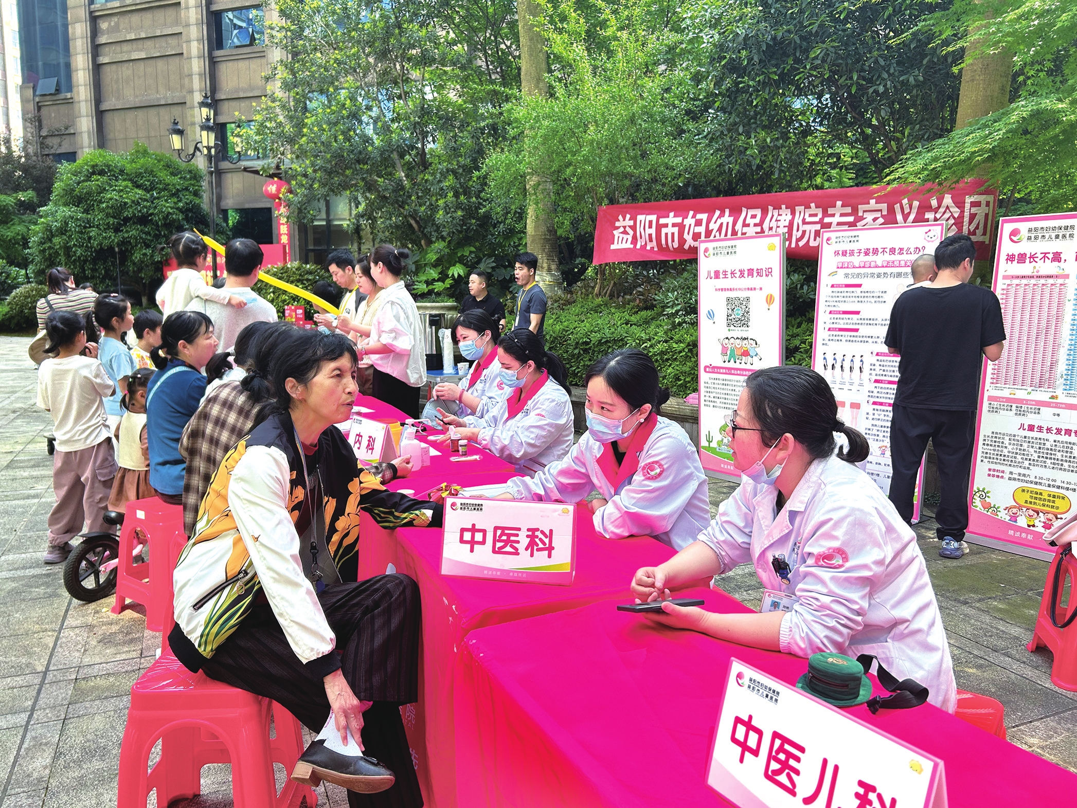 4月19日上午,市妇幼保健院专家义诊团走进赫山区铂金汉宫小区中心广场,来自中医科、内科、康复科、儿童保健科、中医儿科等学科的专家现场问诊,为居民提供血糖血压测量、慢性病管理、中药敷贴、生长发育检测等免费服务。刘美玲 摄