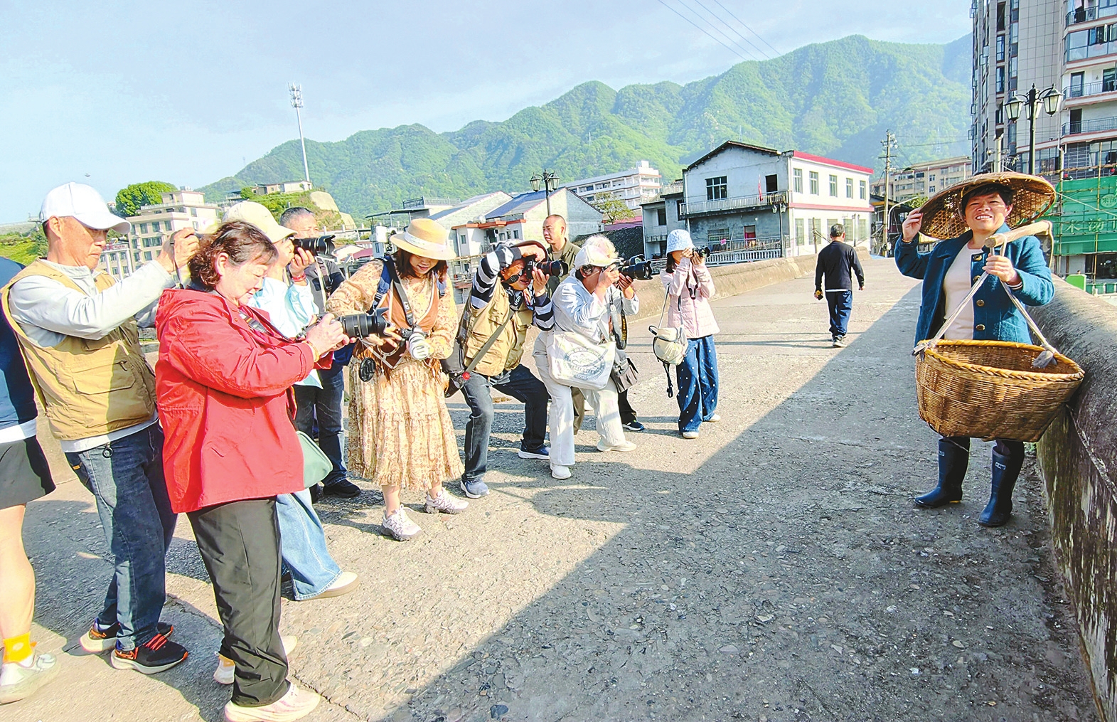 4月19日,益阳市摄影家协会组织40余名会员赴安化县大福镇梅王寨及多个乡村振兴村落采风,分组拍摄古寨风光、民俗风情与春耕生产等场景。图为摄影师们正在拍摄一位春耕抛秧归来的大娘。陈风云 刘华 摄