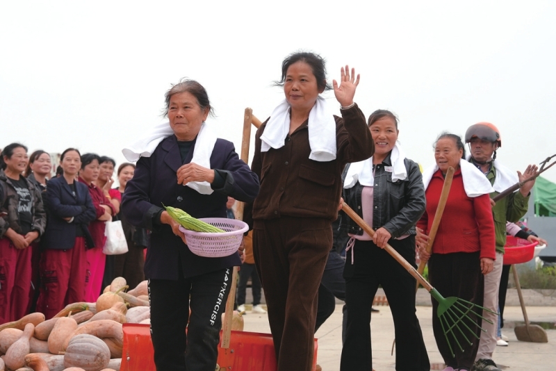 舞台前十分热闹,村民代表们踩着音乐节奏走秀。他们手持锄头、镰刀、簸箕等农具,捧着稻穗、瓜果,挑着箩筐、簸箕,还有的抬着虾笼,分组亮相,憨厚的样子令人忍俊不禁,欢笑声不绝于耳。
