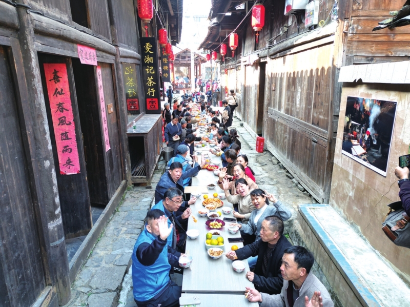 10月28日,安化县东坪镇唐市社区的千年古街被欢声笑语与擂茶清香包裹得严严实实。40余张长桌沿青石板路依次排开,500余名村民欢聚一堂,先赏文艺汇演,再品地道擂茶,共庆重阳佳节。这是唐市社区连续第三年举办重阳节主题活动。