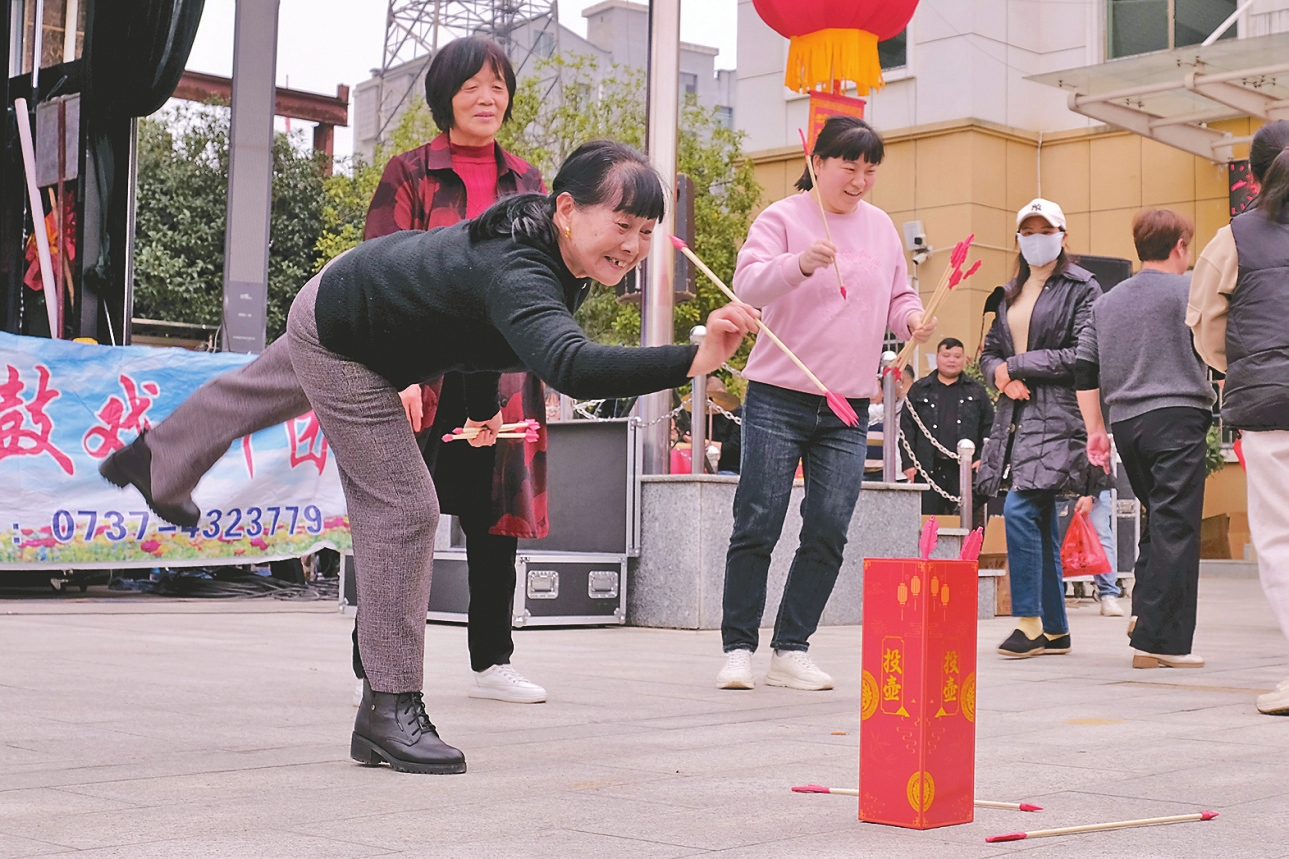 活动现场,社区的老党员盛三才分享了她记忆中最深刻的重阳节,工作人员为3位90岁以上的老人佩戴“长寿之星”绶带,并送上节日礼物与祝福。在投壶趣味游戏环节,工作人员向老人们讲解了投壶的历史渊源与游戏规则。随着一声“开始”,老人们纷纷拿起箭矢,瞄准壶口轻轻投掷,现场欢呼与掌声此起彼伏。精彩的游戏过后,社区才艺秀和花鼓戏表演相继登场,赢得满堂喝彩。“今天太开心了!社区想着我们,活动贴心热闹,心里很温暖。”92岁的包兰英激动地说。