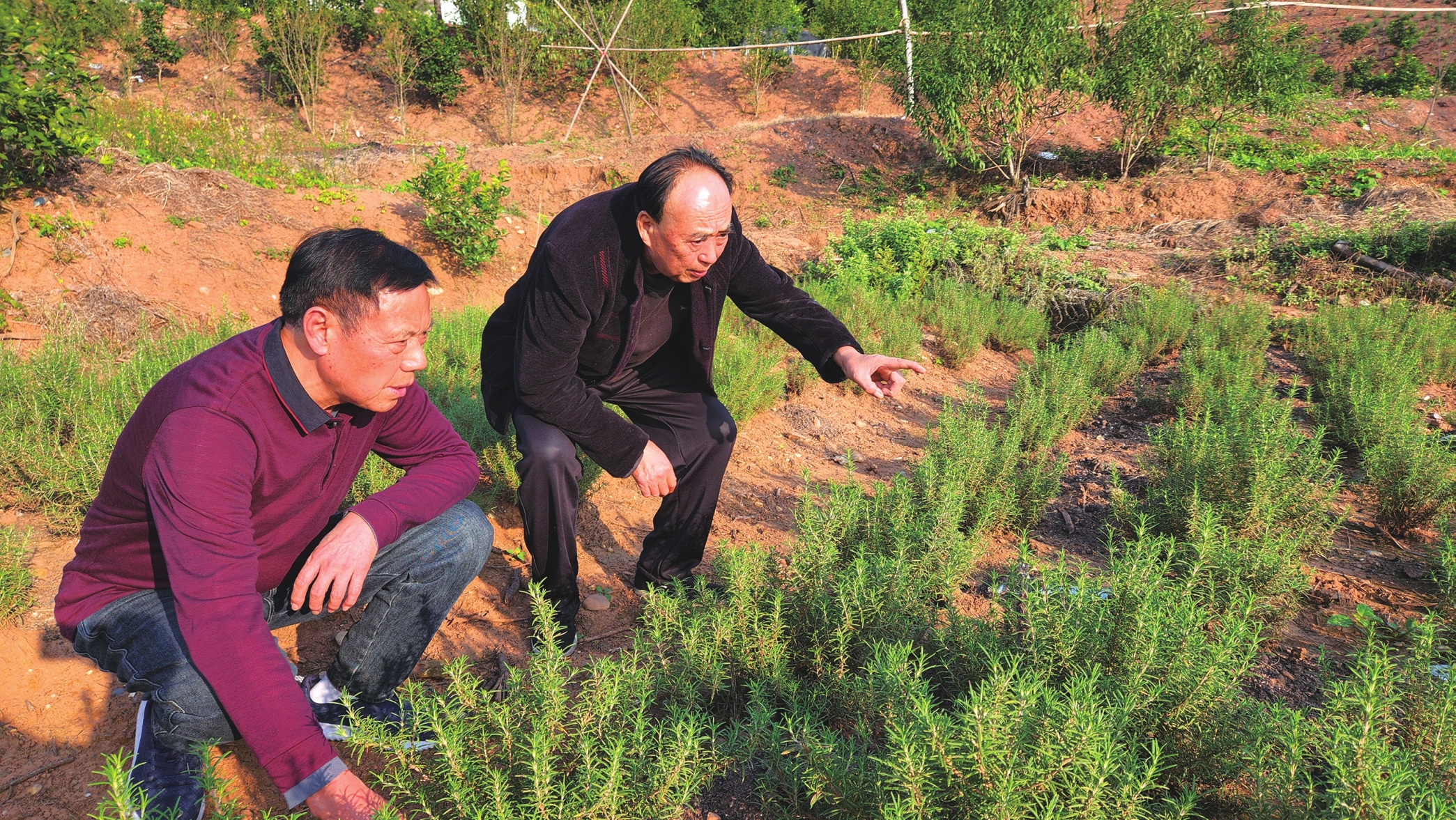 胡平安、罗光明来到农户地里,察看迷迭香生长情况。孙殉华摄