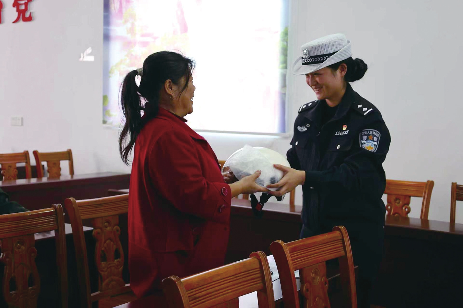 民警向群众发放安全头盔。李胜利摄