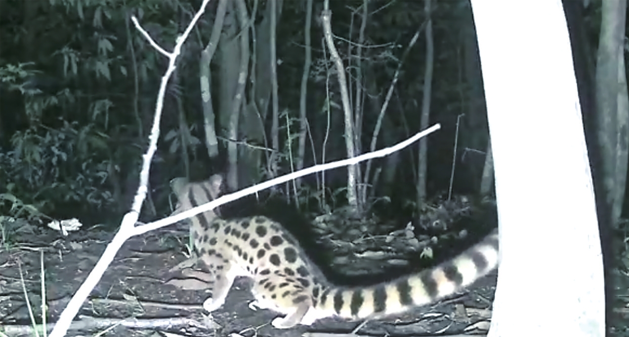 红外相机拍摄的画面中,斑林狸身形修长纤细,四肢短小而灵活,淡褐色皮毛上分布着标志性暗色横带,一条布满9至11个暗色环纹的长尾在林间灵活摆动。作为典型的夜行性树栖动物,它时而在地面轻盈踱步,时而警觉张望,敏锐的感官时刻感知着周围环境,展现了这一珍稀物种典型的行为特征。
