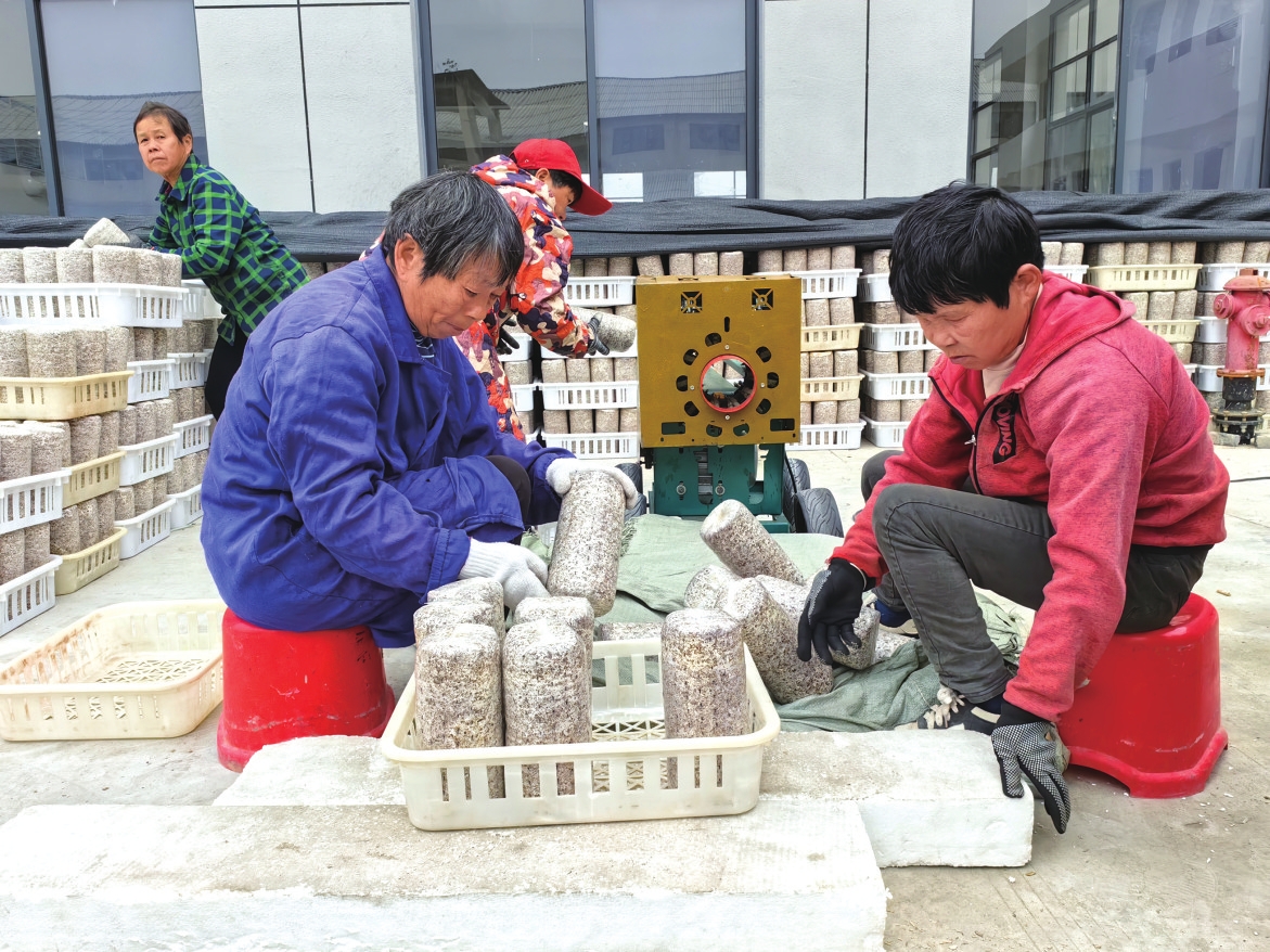 泉交河镇奎星村村民在加工菌包,用于发展庭院经济。曹灿摄