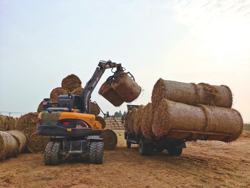 12月4日,在资阳区茈湖口镇祁青村八队的田野上,搂草机和打捆机轮番上阵,秸秆被轧成圆滚滚的草捆,像一个个“黄金面包”错落铺展。随后,草捆被装上货车,送往茈湖口镇秸秆收储中心。