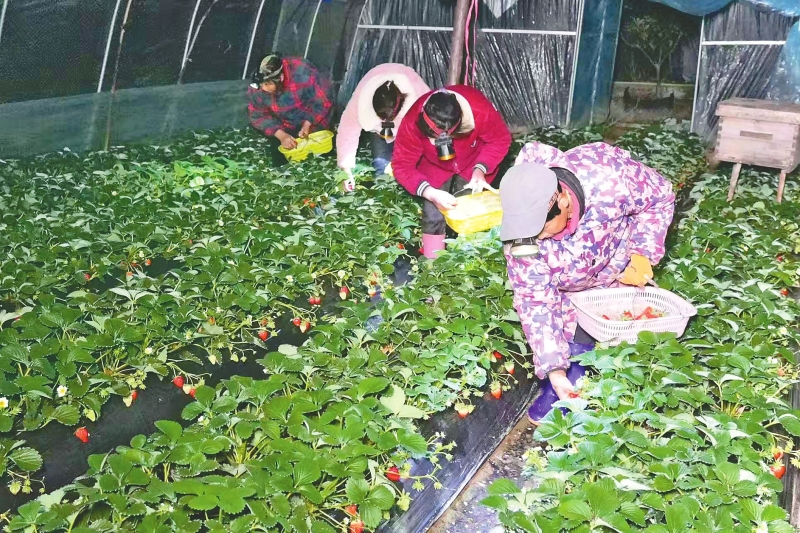 天还未亮,村民们便开始采摘草莓。