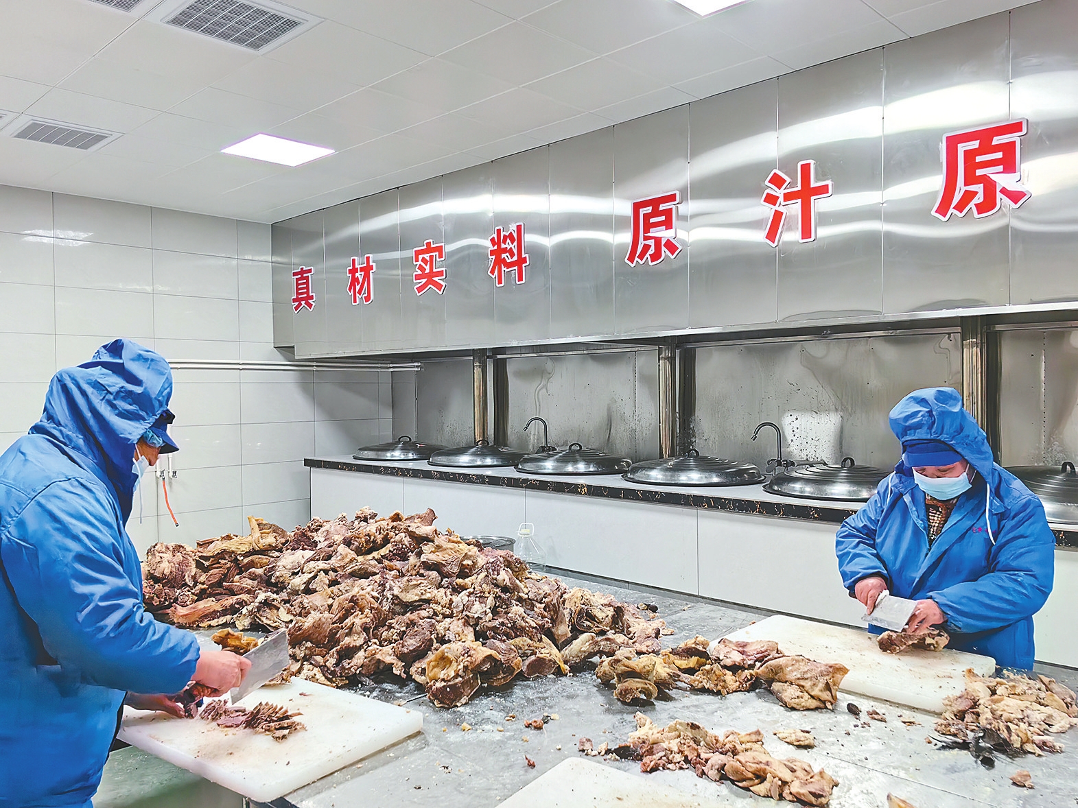 工人们正在加工牛肉。曹灿摄