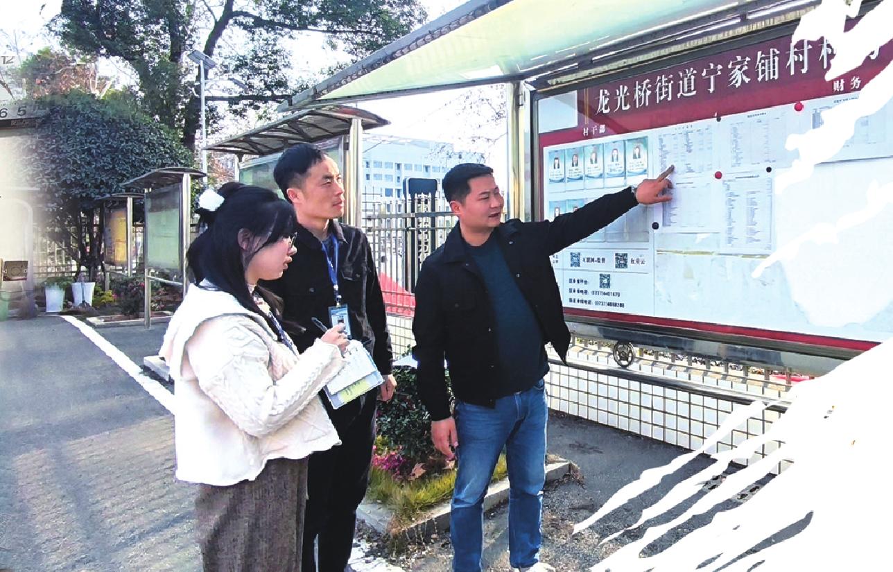 龙光桥街道纪工委干部在宁家铺村督查村级财务公开情况。