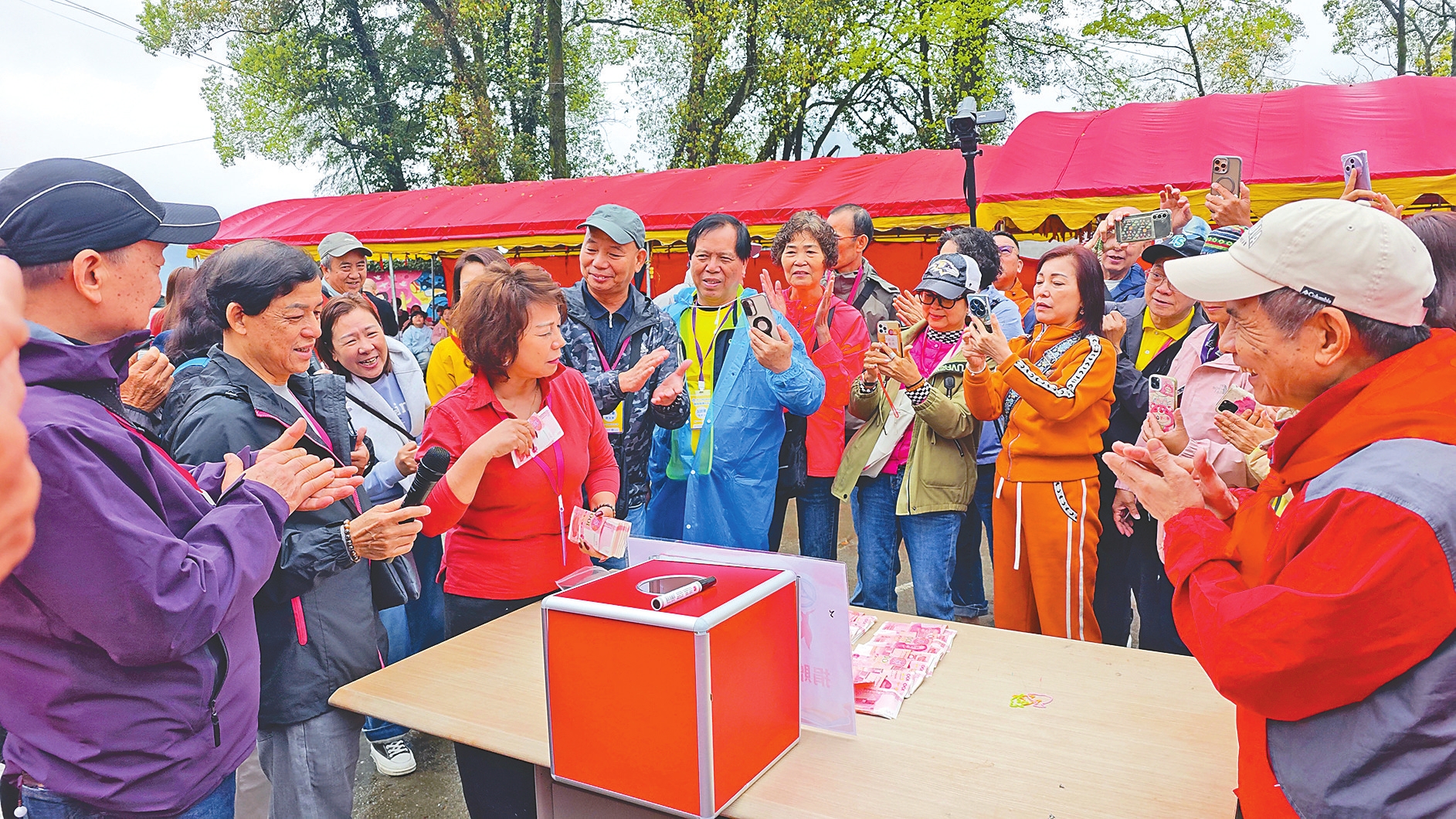 协会骨干率先走到捐款箱前。接着是会员们,一个、两个、十个……队伍排成长龙。主持人报数声越来越高:“你300,我500,我1000……”