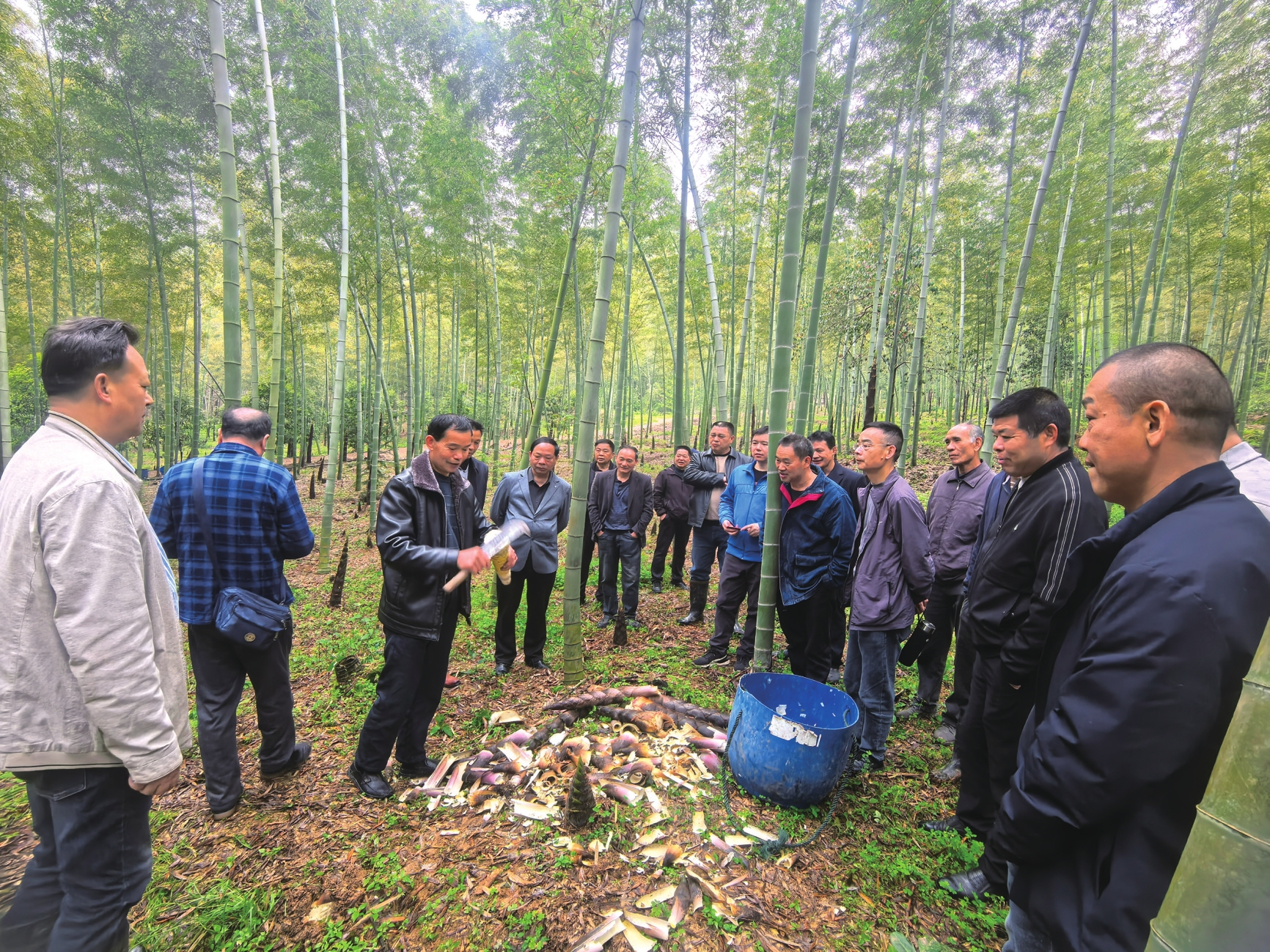 4月8日,在赫山区泥江口镇水满村的笋竹两用林基地里,一场别开生面的“竹博士”“笋专家”现场培训正火热进行。“下锄要稳,找准位置,别把竹鞭挖断了!”笋竹产业资深专家高最华蹲在一株粗壮的竹笋旁,一边挥锄示范,一边提高嗓门向30多名围成一圈的企业代表和承包竹林的竹农们讲解。