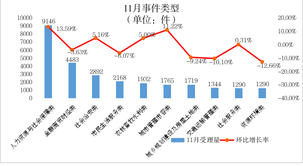 从受理事件大类分析:11月份,事件受理量居前三位的分别为:人力资源与社会保障类、金融商贸财经类、社会治安类。总体情况平稳,无突发和群体性事件。
