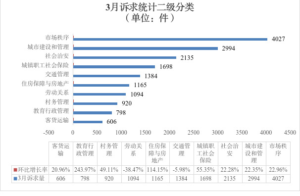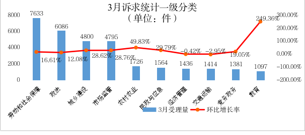 从诉求统计一级分类分析:3月份,事件受理量居前三位的分别为:劳动和社会保障、政法、城乡建设。总体情况平稳,无突发和群体性事件。