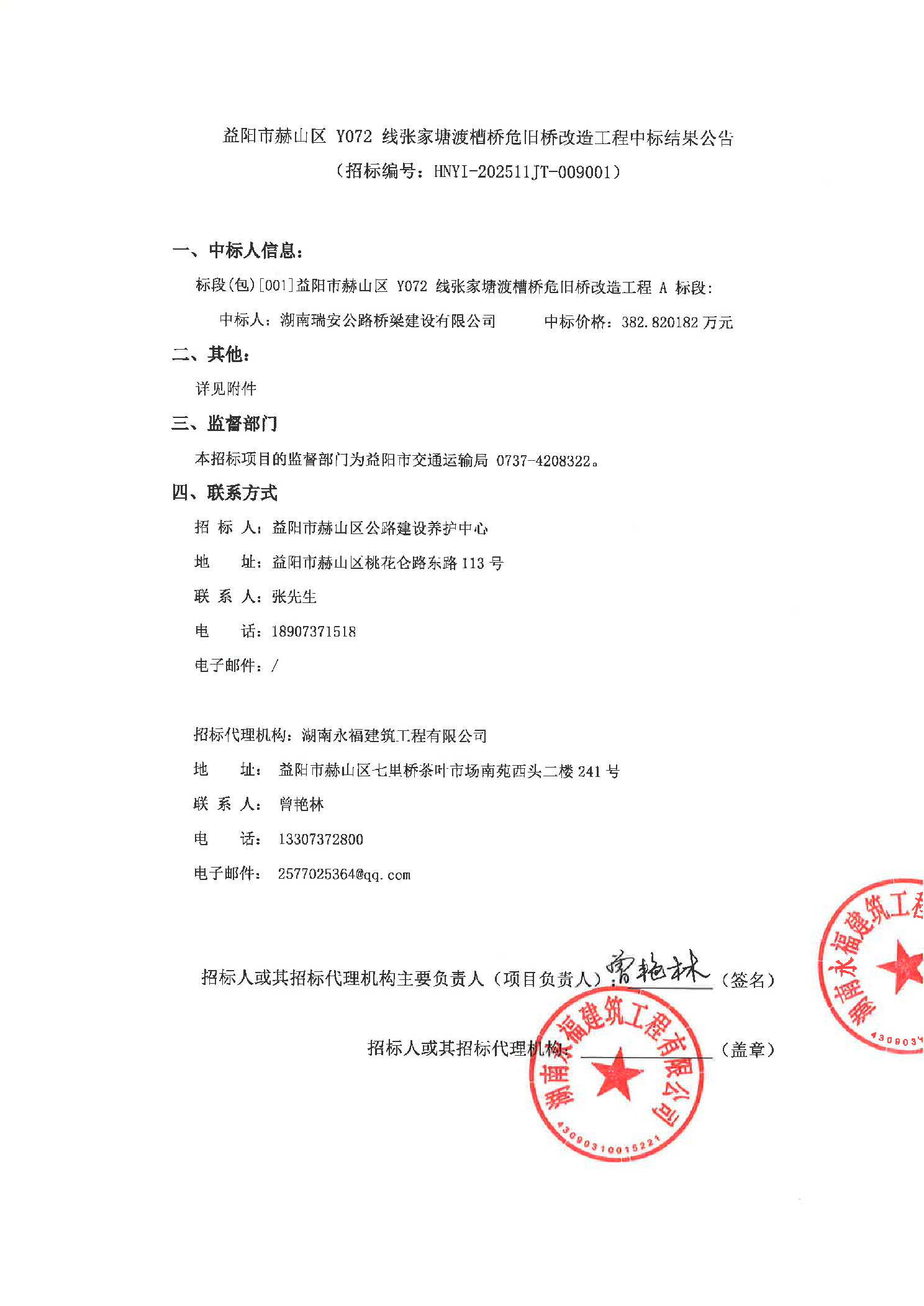 益阳市赫山区Y072线张家塘渡槽桥危旧桥改造工程中标结果公示