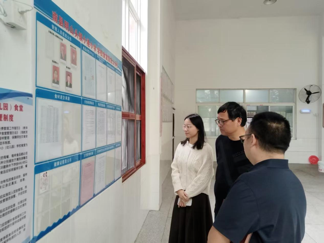 南县明山头镇纪委紧盯“校园餐”领域,围绕学校食堂运营管理、食品安全责任落实、膳食经费管理使用等关键环节开展专项督查,以精准监督守护学生健康成长。图为该镇纪委工作人员查验食堂资质与公示情况。(南县明山头镇纪委 仇泽夫 摄)