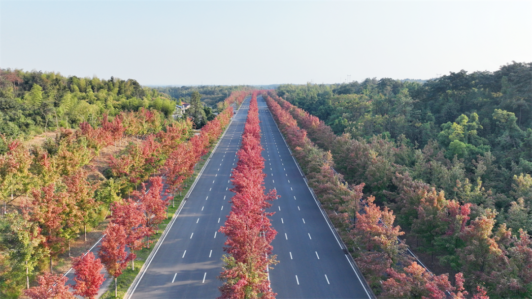 赫山区鱼形山红枫大道,阳光穿过枝叶,织就斑驳的光影,枫叶随秋风摆动,营造出绚丽多彩的秋日氛围。(赫山区融媒体中心供 李成刚 摄)