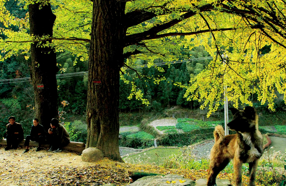安化县古楼乡枫香村,古树巍峨,枝叶繁茂,金黄的叶片是秋洒下的斑驳诗行。树下,老人闲坐,静享岁月安详,似在回味往昔时光。(安化县文联供 刘国平 摄)