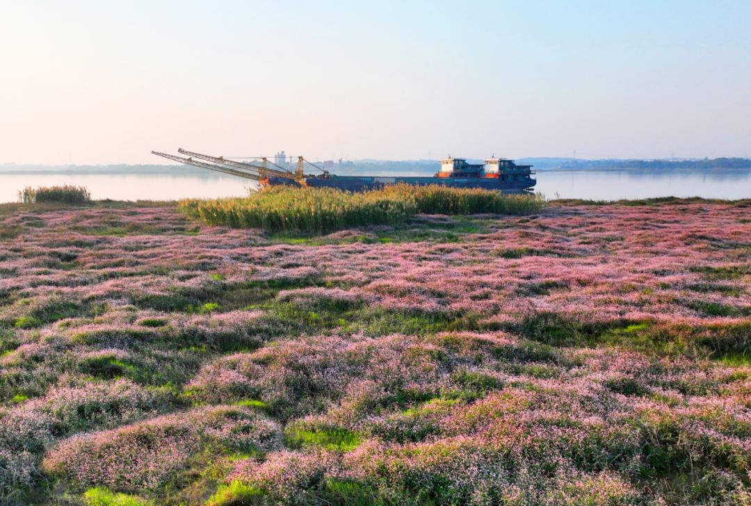 水涨为湖,水落成洲。沅江南洞庭湖的湖洲上,大片辣蓼花正悄然盛放,为初冬调上一抹柔和的粉紫色。两艘船静泊花海之畔,沐浴着融融暖阳,勾勒出一幅水、陆、花、舟和谐共生的静谧冬景。(沅江市纪委监委供 盛拥军 摄)