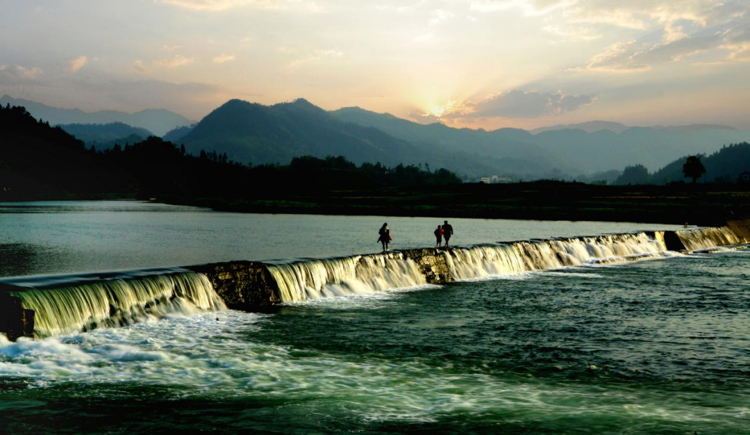 初冬的安化伊水河,碎瀑叠玉,山影浸波,游人踏岸时,夕阳正给茶乡的风镀上金边。(安化县文联供 金晓兵 摄)