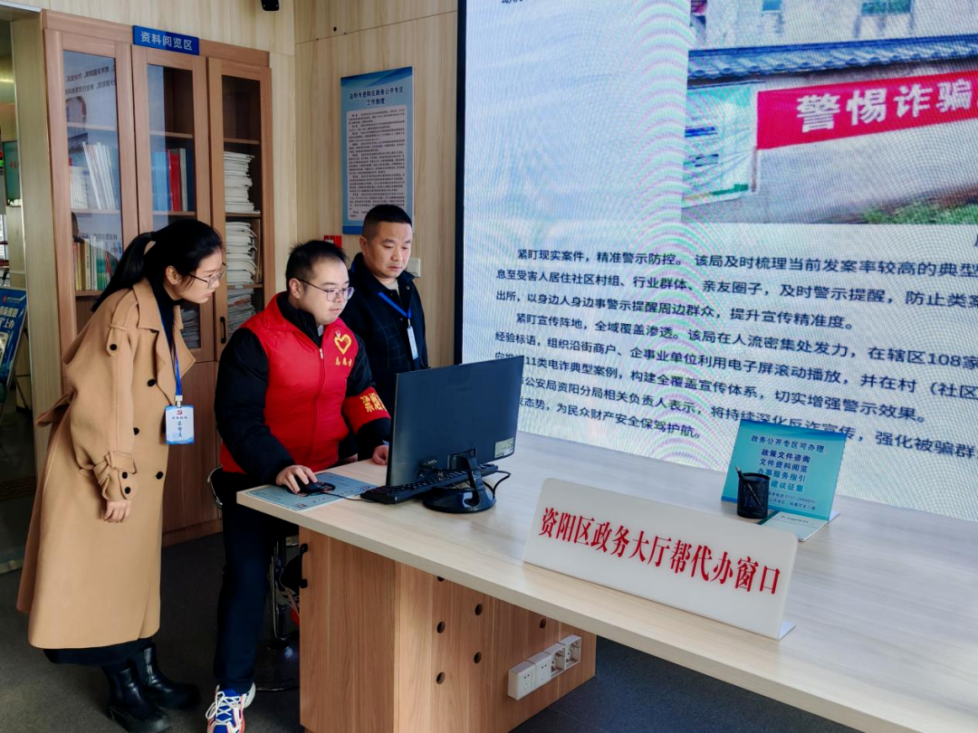 资阳区纪委监委驻区委政法委纪检监察组紧盯政务服务“帮代办”关键环节,针对发现的程序漏洞与责任模糊问题,推动主管部门完善实施细则、规范操作流程。图为纪检监察干部在区政务大厅“帮代办”窗口开展调研监督。(资阳区纪委监委 彭旭婷 摄)