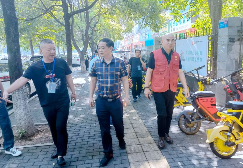 李晓跃一行沿学府路了解路段市政设施、文明劝导、环境卫生、园林绿化等情况,对学府路沿线车辆违规停放垃圾桶布局不合理等问题,逐一进行现场交办。