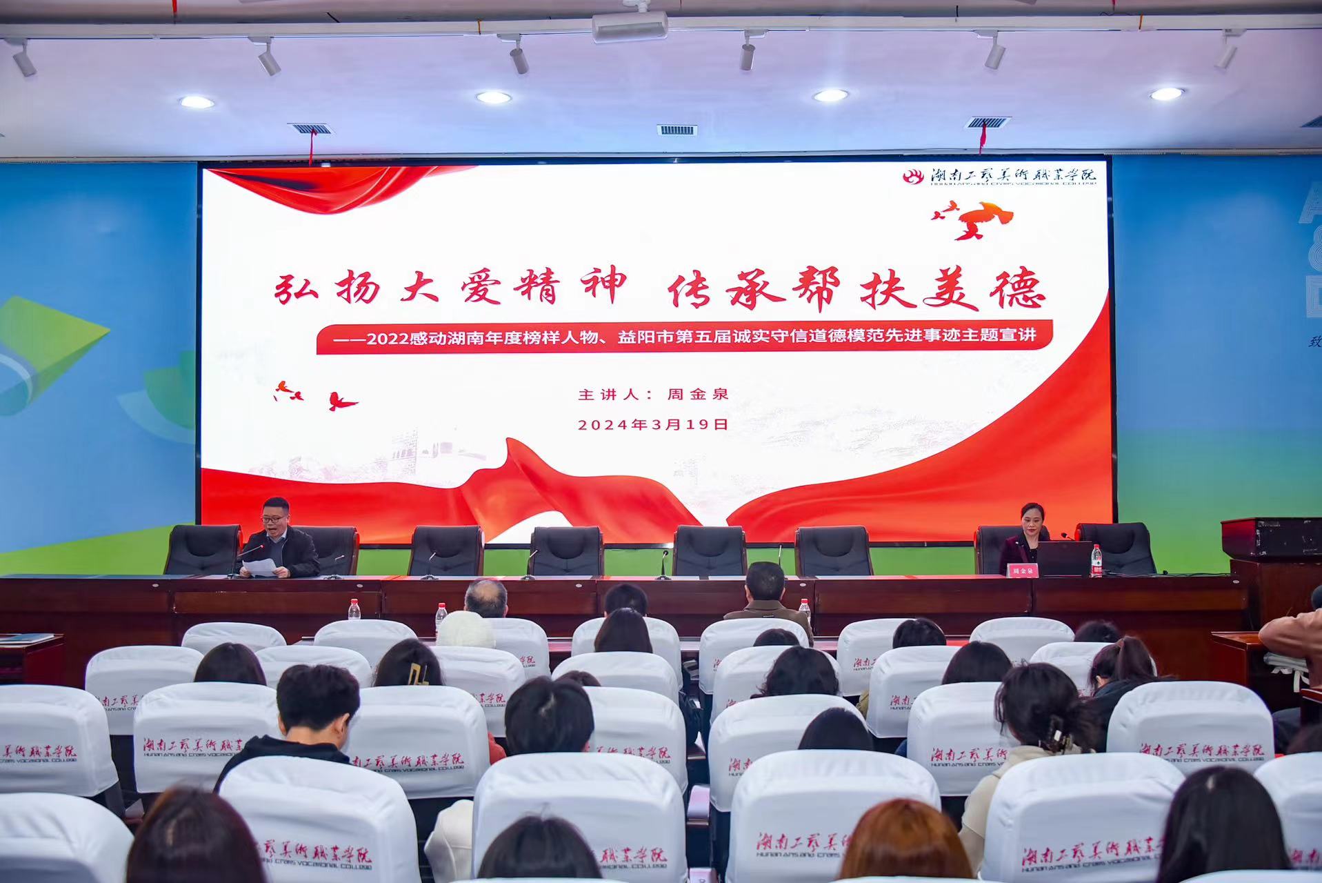 3月19日,益阳市道德模范周金泉到湖南工艺美术职业学院开展“弘扬大爱精神 传承帮扶美德”主题宣讲,激励引导青年大学生争做崇高道德的践行者、文明风尚的维护者、美好生活的创造者,积极投身全国文明城市创建工作。